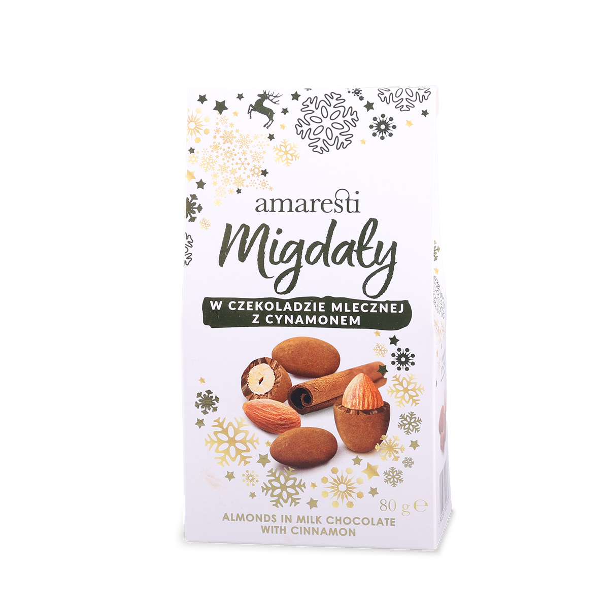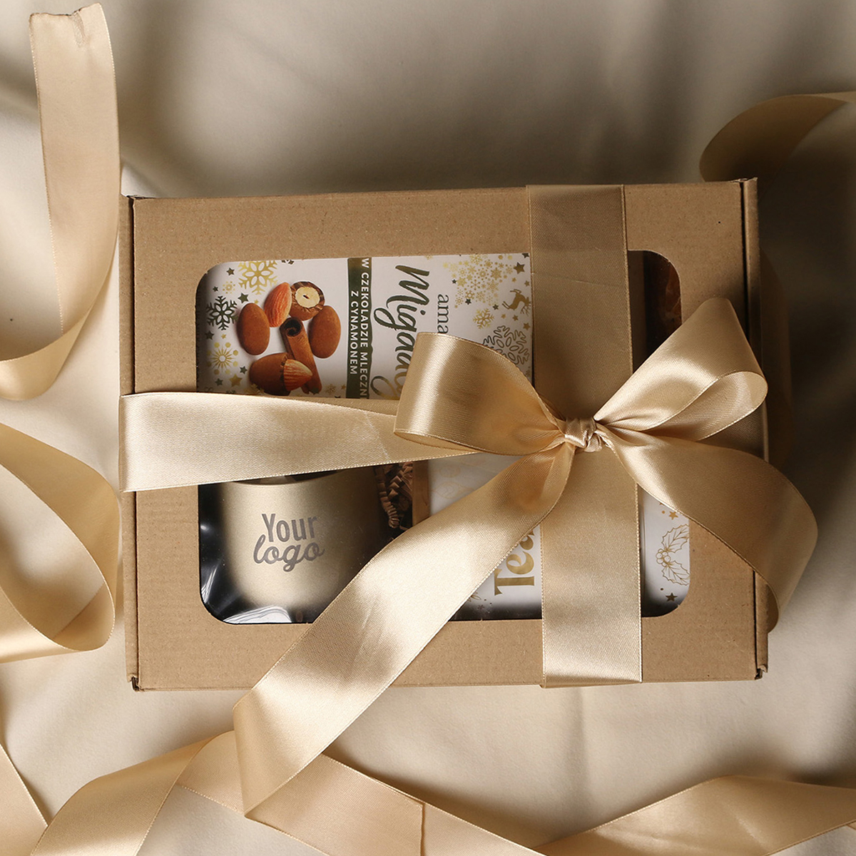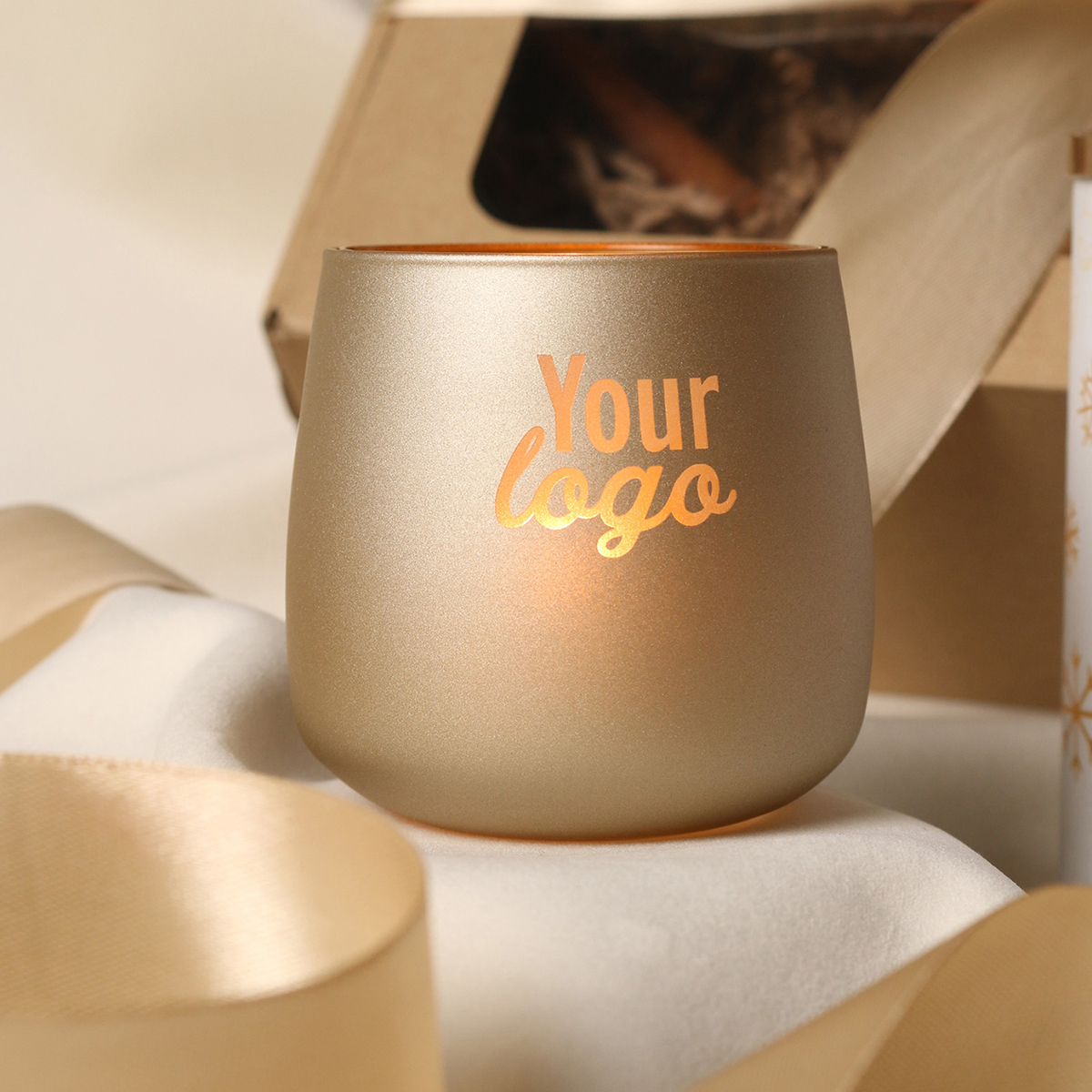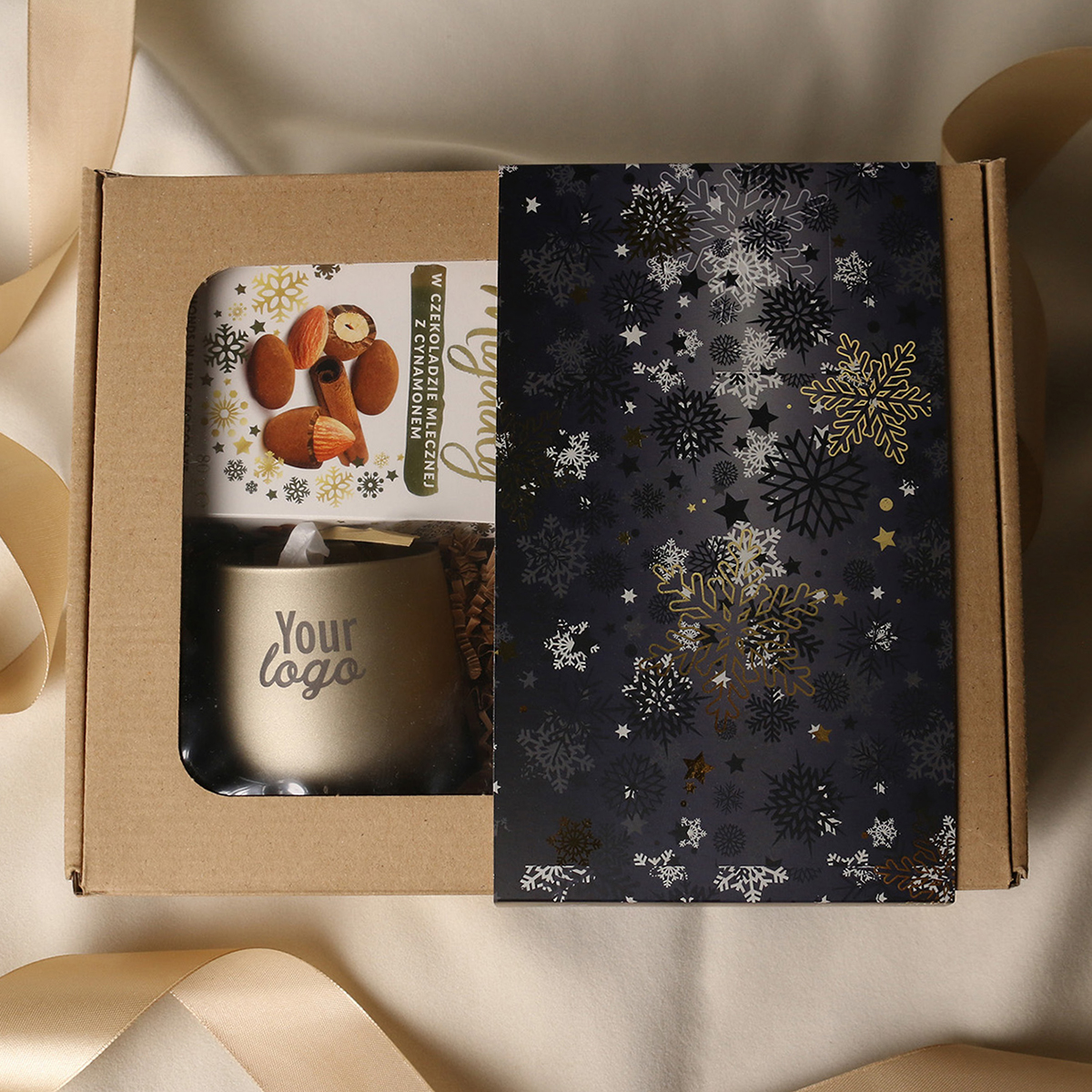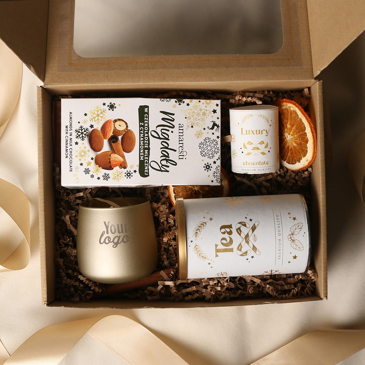 Contents of the set: Sensitive gold matte lantern (with soy tealight) with optional decoration, Amaresti Pralines - almonds in chocolate with cinnamon, Sencha green tea with cherries and rose petals packed in winter motif tube, Luxury Chocolate - Belgian drinking chocolate in winter motif tube. All packed in stylish eco cardboard box with window. Additional customization options: Print on the lantern, company logo tag, ribbon or sleeve with winter motif enriched with gold.