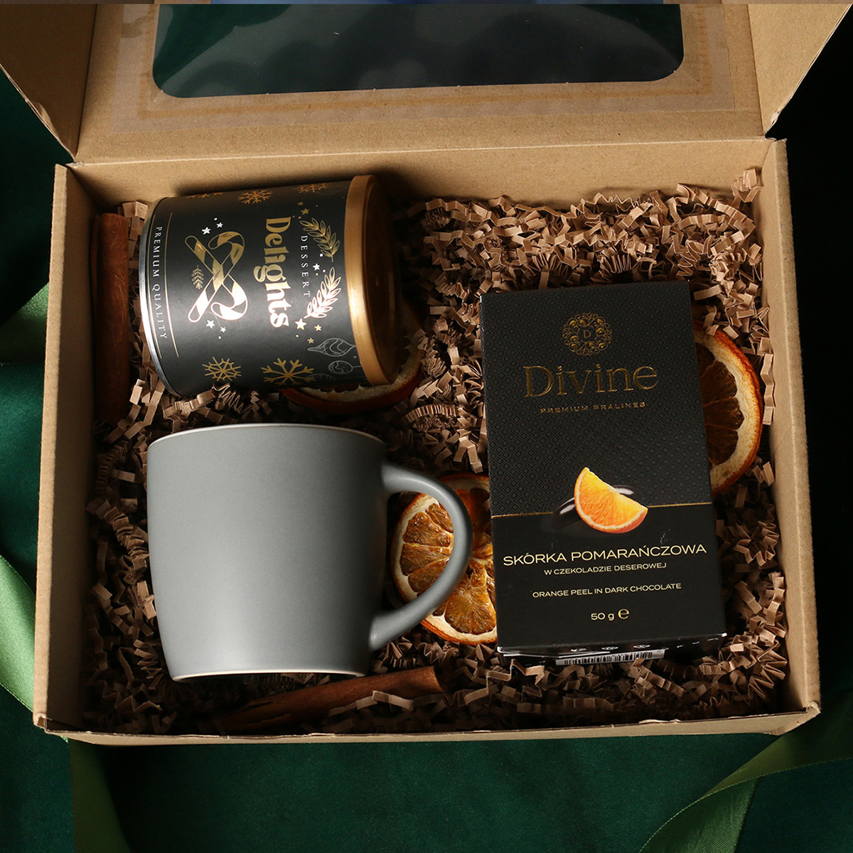 The set includes: Handy Velvet mug rose pink-white / baby blue-white / Handy Cool gray-white with the option of customization, Divine Pralines – almonds in chocolate with raspberry powder (pink) / almonds in chocolate with coconut (blue) / orange peel in dark chocolate (gray), Dessert Delights – blackcurrants in white chocolate with raspberry powder packed in a tube with a winter theme. All packed in a stylish eco cardboard box with a window. Additional customization options: print on the mug, company logo tag, ribbon or sleeve with a winter theme enriched with gold stamping.