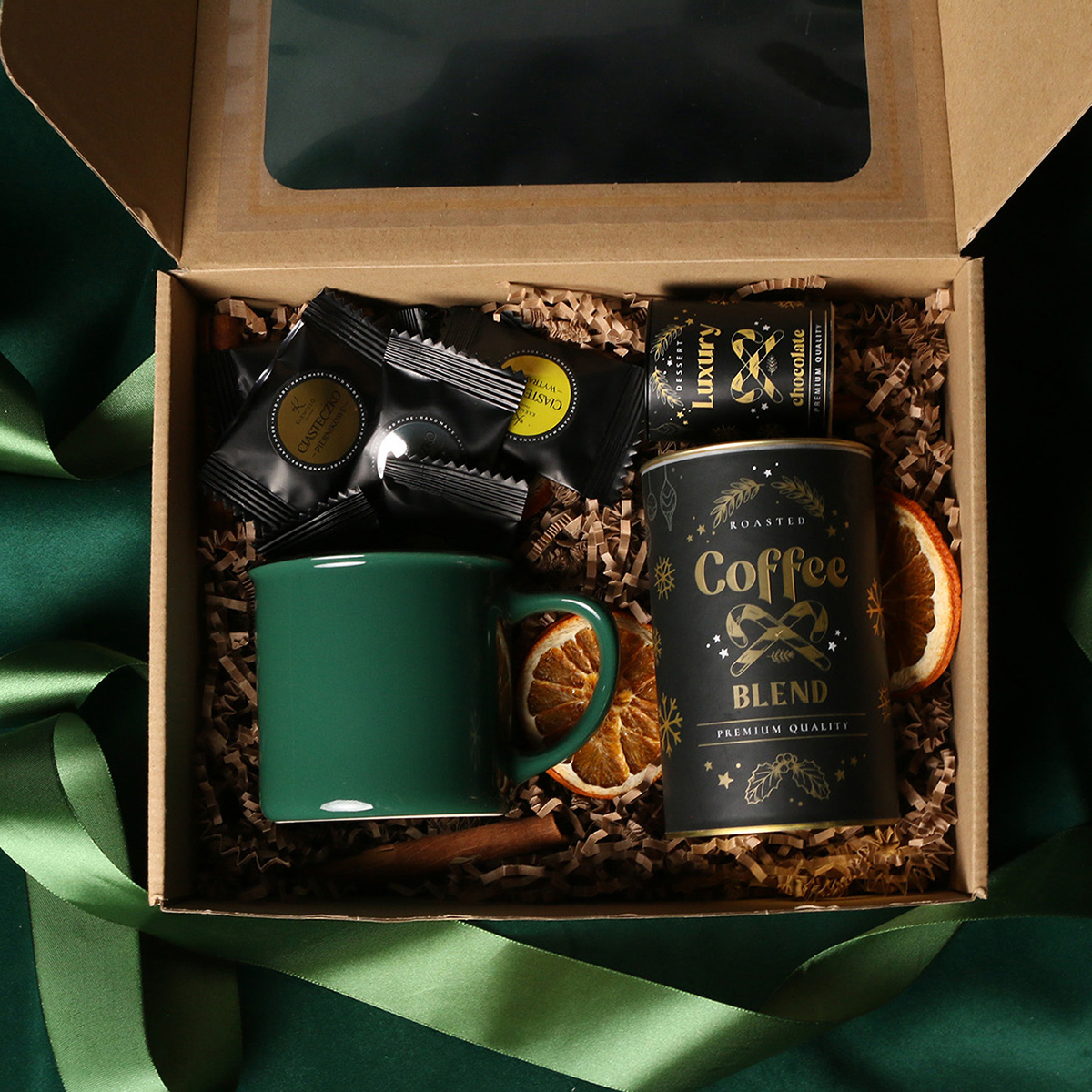 Loft mug in dark green or Loft Supreme in red and black Warming Belgian drinking chocolate 40g Aromatic Arabica Brazil Cerrado Mineiro coffee beans in a 150g tin Exclusive student cookies 8 pcs – assorted flavors Elegant packaging decorations: color-coordinated ribbon or banderole